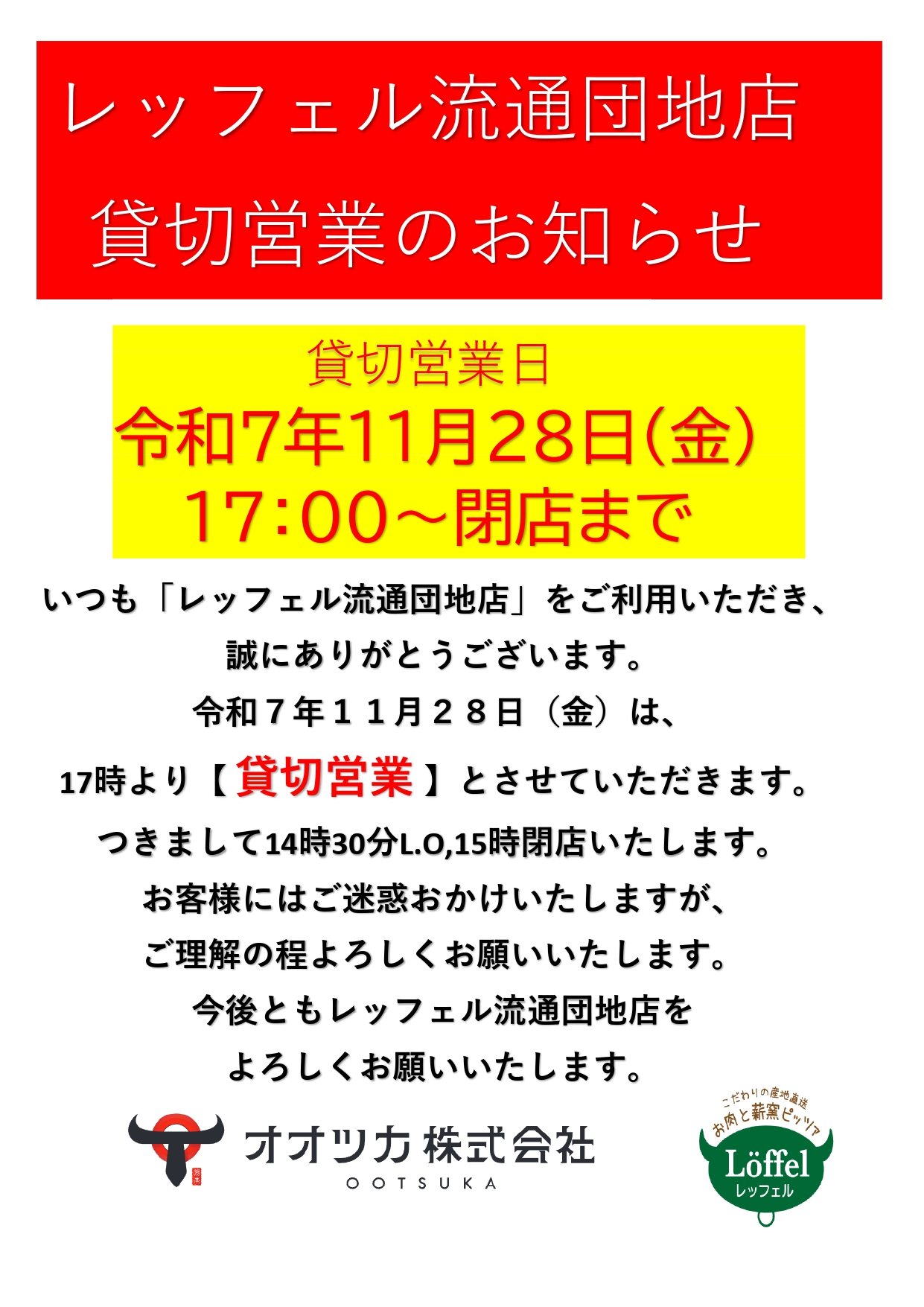 レッフェル流通団地店は、2025/11/28(金)17時より【貸切営業】となるため、