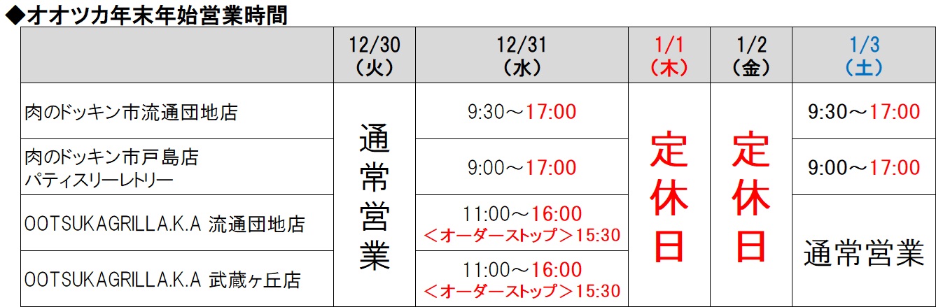 なお、各店舗の年末年始の営業時間は、下記の通りとさせていただきます。